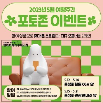 문예진흥원 관광본부는 대구광역시의 메가 이벤트인 ‘판타지아대구페스타’ 봄 시즌 축제의 시작을 알리는 ‘2023 파워풀 대구 페스티벌’ 개최를 맞아 관광객의 동성로 방문을 유도하기 위해 대구 5월 여행주간을 운영하며 대구관광의 매력을 느낄 수 있는 다양한 유형의 이벤트를 진행할 예정이다.