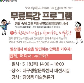 [제주교통복지신문 김강석 기자] (재)대구문화예술진흥원은 시민들의 생활문화 향유의 기회를 확대하기 위해 대구생활문화센터 대전시실에서 5월 18일 ‘생활 속에 그린 백화난만(百花爛漫)의 세상’ 강연을 진행한다.