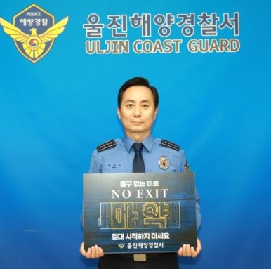 [제주교통복지신문 김강석 기자] 울진해양경찰서장 최원식 총경은 12일 경찰청과 한국마약퇴치운동본부가 마약퇴출을 위한 국민 의지 확산을 위해 시작한 마약범죄 예방 릴레이 ‘NO EXIT’ 캠페인에 동참 했다고 밝혔다