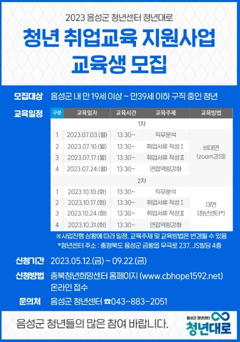 [제주교통복지신문 김강석 기자] 음성군이 2023년 청년 취업교육 지원사업 교육생을 모집한다고 15일 밝혔다.