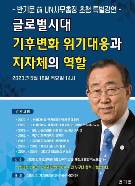 [제주교통복지신문 김강석 기자] 제천시는 오는 18일 오후 2시 한방생명과학관 1층 다목적강당에서 반기문 전 UN사무총장을 초청해 특별강연을 개최한다.
