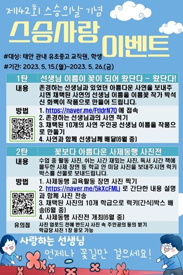 [제주교통복지신문 김강석 기자] 태안교육지원청은 제42회 스승의 날을 맞이하여 5월15일부터 5월26일까지 ‘스승 사랑 이벤트’를 실시한다.