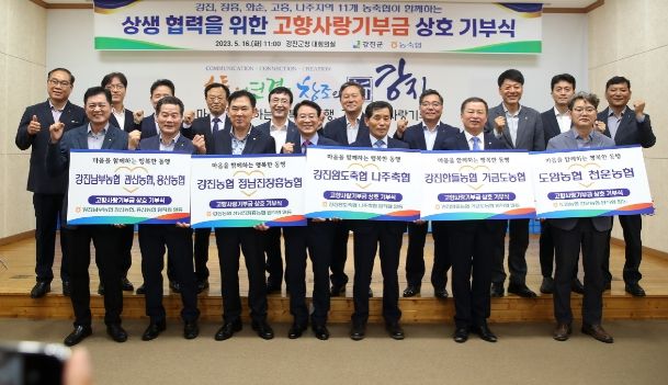 [제주교통복지신문 김강석 기자] 강진군은 16일 강진군청 대회의실에서 강진, 장흥, 화순, 고흥, 나주지역의 11개 농축협이 동참하는 ‘상생협력을 위한 고향사랑기부금 상호기부식’을 가졌다고 당일 밝혔다.