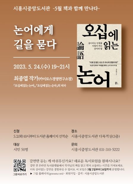 강연은 시흥시중앙도서관 다목적실에서 5월 24일 저녁 7시에 열린다. 특히 일회성 강연에 그치지 않고, 시민들의 생활 속 독서로 이어질 수 있도록 온라인 플랫폼 ‘그믐’을 활용한 사전 독서모임도 함께 운영한다.