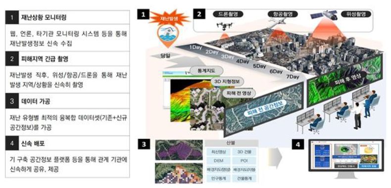 국토지리정보원은 '20년부터 국내에서 발생한 대형 재난에 대해 피해분석 정보 등을 관계기관에 지원하기 위해 ‘긴급 공간정보’를 제공 중으로, 올해는 국내 산불(충남 홍성, 서울 종로 등 8건)에 대한 긴급 공간정보를 제공했으며, 해외 재난 구조 활동 및 복구지원 등에 기여하고자 올해 2월 튀르키예 지진 시 국토위성으로 촬영한 영상을 제공한 바 있다.