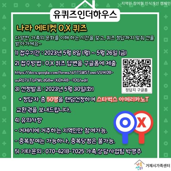나라에티켓 O,X 퀴즈는 2023년 5월 8일부터 진행 중이며, 5월 26일 금요일까지 온라인(구글폼)으로 접수가 가능하다. 참가를 원하는 지역민은 거제시가족센터 홈페이지 혹은 사진 자료 속 큐알코드를 통해 참여할 수 있다.