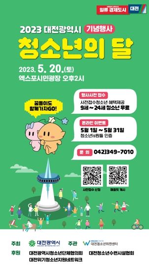 [제주교통복지신문 김강석 기자] 대전시가 주최하고 대전청소년위캔센터가 주관하는 2023년 청소년의 달 기념행사가 5월 20일 오후 2시에 대전엑스포시민광장에서 개최된다.