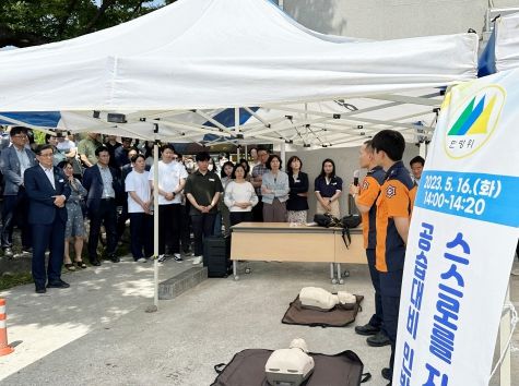 이날 오후 2시 공습경보 발령과 동시에 전 직원들이 신속하게 가까운 대피소로 대피했으며, 이어 함양소방서 예방교육계의 주도로 응급처치교육(심폐소생술 및 AED 사용법)에 대한 시범과 직원들 실습이 이뤄져 스스로를 지키는 생존훈련의 중요성을 배울 수 있었다.