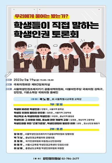 [제주교통복지신문 김강석 기자] 더불어민주당 강민정, 강득구, 기본소득당 용혜인 의원은 서울학생인권조례지키기 공동대책위원회와 함께 2023년 5월 19일 15시 국회의원회관 제9간담회의실에서 ‘우리에게 물어는 봤는가? 학생들이 직접 말하는 학생인권’ 토론회를 개최한다.