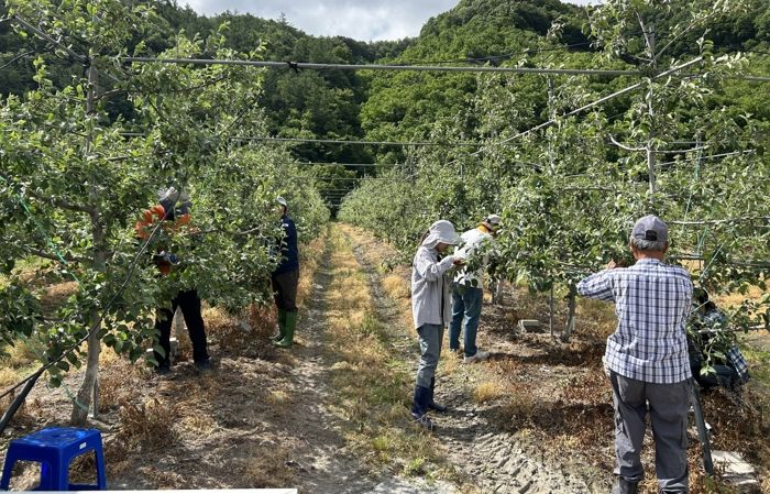 이날 직원들은 무더운 날씨에 구슬땀을 흘리며 사과 열매솎기 작업을 진행했다. 열매솎기는 알맞은 양의 과실만 남기고 따버리는 작업으로 크고 올바른 모양의 과실을 수확하기 위해 꼭 필요한 작업이다.