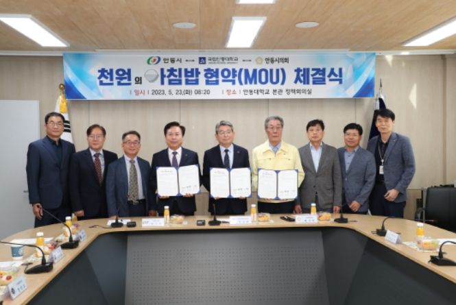 [제주교통복지신문 김강석 기자] 안동시는 23일 안동대학교 정책회의실에서 안동대학교, 안동시의회와 함께 대학생들의 아침을 천원에 제공하는‘천원의 아침밥’ 업무협약(MOU)을 체결했다.
