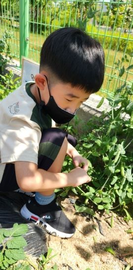 텃밭에서 직접 식물을 재배하면서 바깥 놀이와 산책을 통해 완두콩이 자라난 것을 자연스럽게 관찰한 아이들이“선생님 완두콩이 많이 열렸어요.”라며 완두콩에 관심을 가졌다. 다 자란 완두콩을 따보며 아이들 스스로 관찰하는 시간을 가졌다.