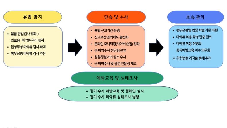 「군 마약류 관리 개선방안」은 “마약없는 건강한 병영문화 조성”을 목표로 「군 마약류 관리대책 추진 전담팀(TF)」에서 마련한 △유입 방지 △단속 및 수사 △후속 관리 △예방교육 등 분야별 개선방안을 포함하고 있다.