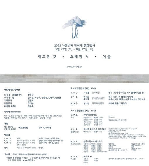 [제주교통복지신문 김강석 기자] 산청군 단성면 경호강변 묵하마을에 자리한 서당 학이재에서 오는 27일부터 6월 17일까지 ‘2023 아홉 번째 학이재 문화행사’가 열린다.