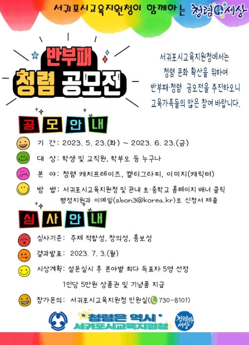 [제주교통복지신문 박희찬 기자] 서귀포시교육지원청은 5월 23일부터 6월 23일까지 교직원, 학생, 학부모 등을 대상으로‘2023년 반부패·청렴 공모전’을 추진한다고 밝혔다.