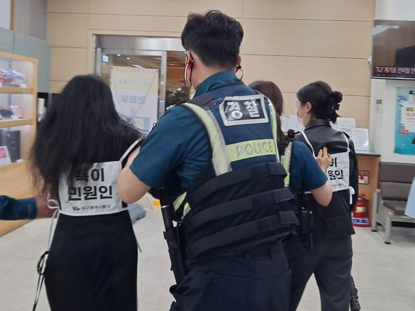 [제주교통복지신문 김강석 기자] 대구 동구청은 지난 23일 종합민원실에서 공무원, 경찰 등 15여 명이 참석한 가운데 폭언‧폭행 등 비상 상황 발생 시 대응능력을 향상하고 안전한 근무환경 조성을 위해 모의훈련을 실시했다.