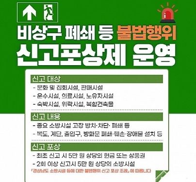 [제주교통복지신문 김강석 기자] 양주소방서는 화재로 인한 인명피해를 줄이고 안전의식을 향상 시키고자 비상구 폐쇄 등 불법행위 신고포상제를 상시 운영한다고 알렸다.