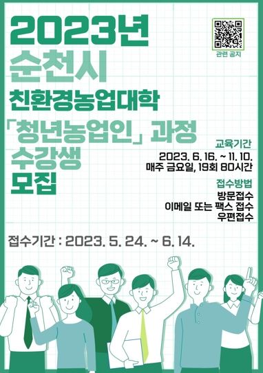 [제주교통복지신문 김강석 기자] 순천시는 농업·농촌을 이끌어갈 청년농업인을 육성하기 위해 2023년 친환경농업대학 ‘청년농업인’과정 교육생을 6월 14일까지 모집한다.