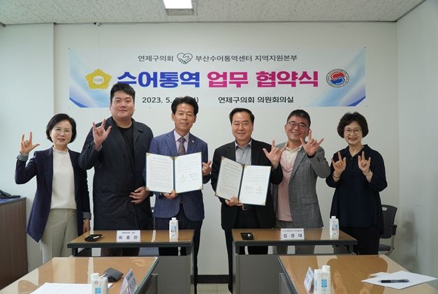 [제주교통복지신문 김강석 기자] 부산광역시 연제구의회는 5월 30일 수어통역 서비스 운영을 위해 부산수어통역센터 지역지원본부(본부장 김경대)와 의정활동 수어통역 지원 업무를 위한 상호 협약을 체결했다.