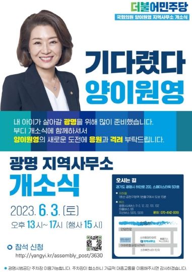[제주교통복지신문 김강석 기자] 양이원영 국회의원(더불어민주당, 비례대표)이 오는 6월 3일 15시 전·현직 국회의원, 광명 지역 주요 인사, 광명시민, 당원 등이 참석한 가운데 광명 지역사무소 개소식을 개최한다.