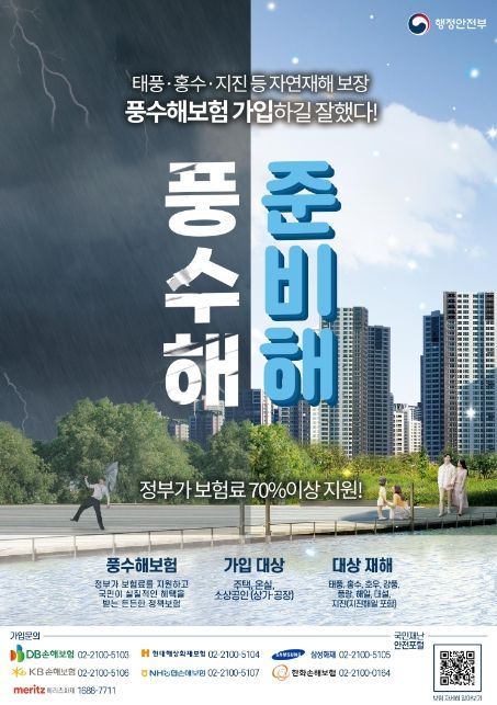 풍수해보험은 예기치 못한 태풍, 홍수, 호우, 강풍, 풍랑, 해일, 대설, 지진 등 재해 시 피해복구를 돕고 물적 보상을 지원하는 선진형 재난관리제도다. 행정안전부와 지자체가 계층별로 보험료를 70~92%까지 지원해 자부담은 30~8% 만 부담하면 된다. 피해발생 시에는 최대 90%까지 피해금액을 보상받을 수 있어 이점이 크다.