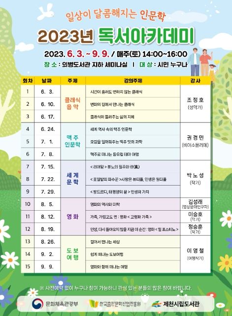 [제주교통복지신문 김강석 기자] 제천시립도서관이 ‘2023년 독서아카데미’사업 수행기관으로 선정돼 오는 3일부터 매주 인문강좌를 진행한다.