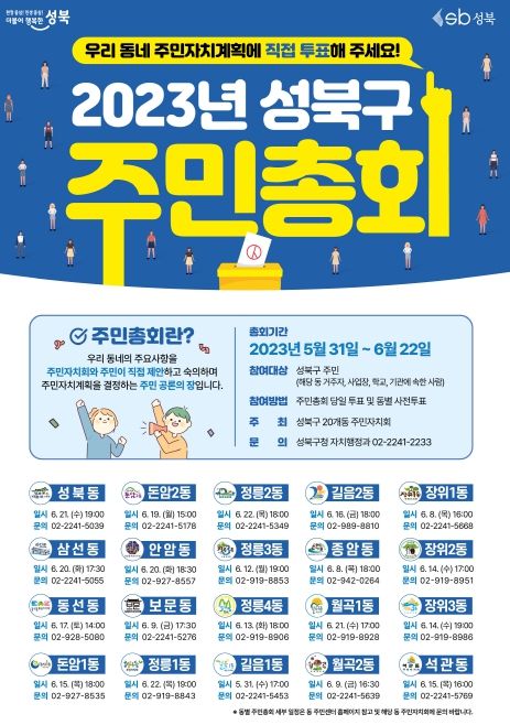 [제주교통복지신문 김강석 기자] 서울 성북구가 ‘주민총회’를 20개 전 동에서 개최한다. 5월 31일 길음1동을 시작으로 6월 22일까지 한 달간 성북구 모든 동에서 차례로 주민총회를 열 예정이다.