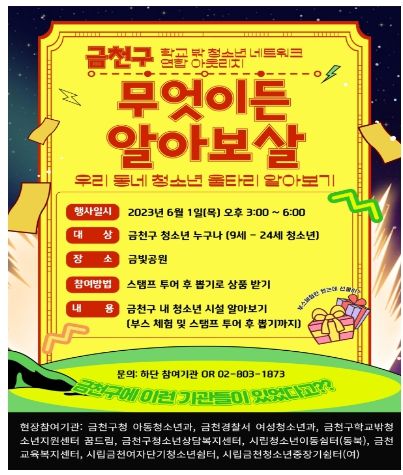 [제주교통복지신문 김강석 기자] 금천구는 6월 1일 오후 3시 금빛공원에서 학교 밖 청소년 관련 기관이 연합해 캠페인 ‘무엇이든 알아보살(우리 동네 청소년 울타리 알아보기)’을 진행한다고 밝혔다.