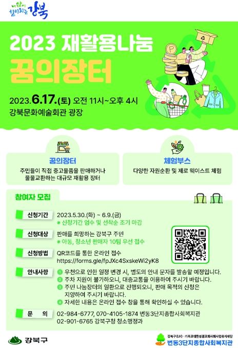 판매를 희망하는 구민은 홍보포스터의 QR코드 또는 강북구 홈페이지 새소식란에 게재된 링크를 통해 6월 9일(금)까지 신청하면 된다. 구는 아이들에게 경제활동 체험기회를 제공하기 위해 아동‧청소년 판매자 10팀을 우선 선발할 예정이다.