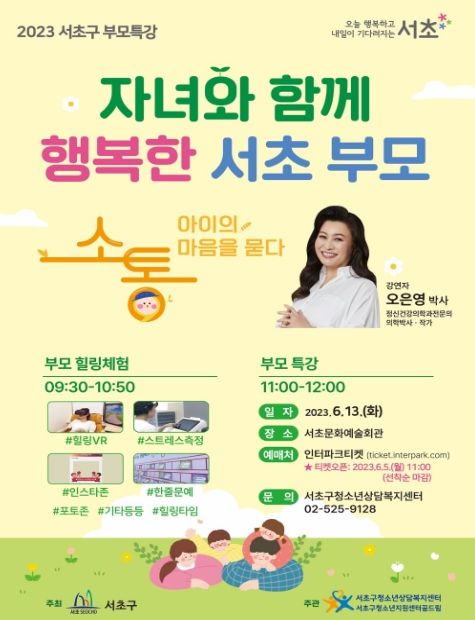 구는 ‘국민육아멘토‘ 오은영 박사를 초청, ‘소통, 아이의 마음을 묻다’를 주제로 아동 및 청소년 자녀를 둔 부모들의 고민을 해결하고 자녀와의 원활한 소통을 돕는 자리를 마련했다. 서초 부모 650여 명을 대상으로 자녀의 마음을 이해하고 진솔하게 소통하는 방법에 대해 1시간 동안 알기쉽고 유익한 강의가 진행될 예정이다.