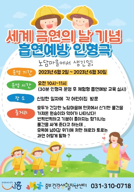 [제주교통복지신문 김강석 기자] 시흥시는 세계 금연의 날을 맞아 어린이를 위한 흡연예방 인형극 ‘노담마을에서 생긴 일’을 개최한다.