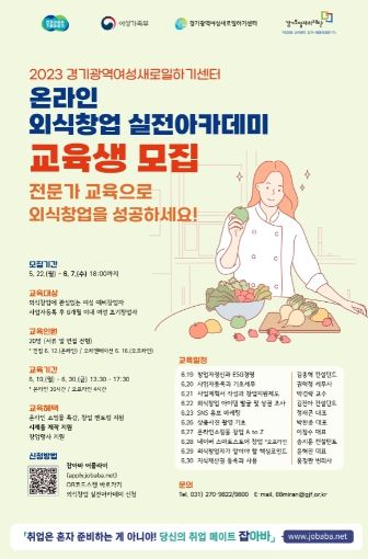 [제주교통복지신문 김강석 기자] 경기도일자리재단내 경기광역여성새로일하기센터가 여성들의 성공적인 외식 창업을 지원하기 위한 ‘온라인 외식창업 실전아카데미’ 교육생을 모집한다.