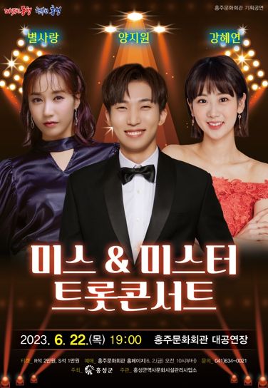 [제주교통복지신문 김강석 기자] 대한민국을 트롯 열풍으로 물들인 ‘미스 & 미스터 트롯’ 프로그램 출신의 별사랑, 강혜연, 양지원이 6월 22일 오후 7시 홍주문화회관에서 화려한 무대로 홍성군민과 만남을 가질 예정이다.