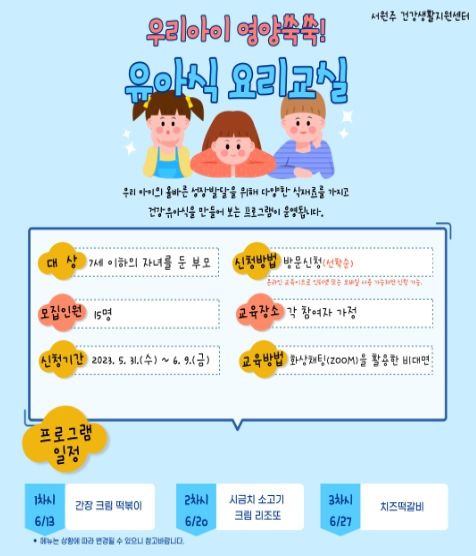 [제주교통복지신문 김강석 기자] 서원주 건강생활지원센터는 6월 13일부터 유아의 건강한 식습관 형성을 위한 '우리아이 영양쑥쑥 요리교실'을 운영한다.