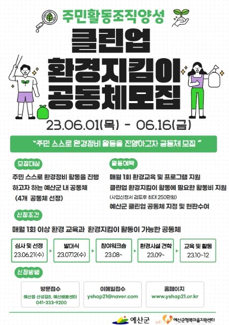 [제주교통복지신문 김강석 기자] 예산군행복마을지원센터는 주민 주도의 마을 환경정비 활동 추진을 위한 ‘주민활동조직양성 클린업 환경지킴이’ 참여 대상 공동체를 모집한다.