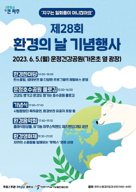 [제주교통복지신문 김강석 기자] 파주시와 파주시지속가능발전협의회는 6월 5일 운정건강공원(가온초 옆 광장)에서 제28회 환경의 날 기념행사를 개최한다.