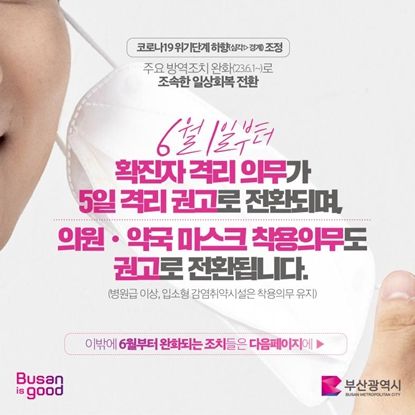 [제주교통복지신문 김강석 기자] 부산시는 오는 6월 1일부터 코로나19 감염병 재난 위기경보 단계가 ‘심각’에서 ‘경계’로 하향 조정됨에 따라 시민들의 안전한 일상 회복을 위한 대응계획을 수립하고 주요 방역 조치를 완화한다고 밝혔다.