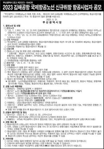 [제주교통복지신문 김강석 기자] 부산시는 오늘(31일)부터 다음 달 30일까지 '2023 김해공항 국제항공노선 신규취항 항공사업자 공모'를 진행한다고 밝혔다.