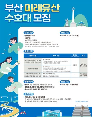 [제주교통복지신문 김강석 기자] 부산시는 ‘부산미래유산 수호대’를 오늘(31일)부터 6월 19일까지 모집한다고 밝혔다.