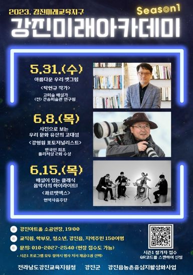 [제주교통복지신문 김강석 기자] 강진군은 군, 전라남도강진교육지원청, 강진읍농촌중심지활성화사업이 공동 주관하는 ‘강진미래아카데미 시즌 1’을 개최한다고 31일, 밝혔다.