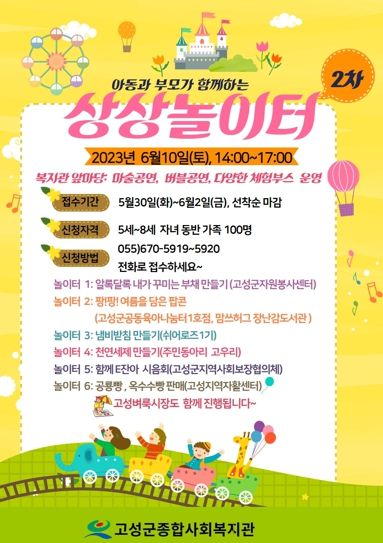 [제주교통복지신문 김강석 기자] 고성군종합사회복지관은 6월 10일 종합사회복지관 본관 앞마당에서 열릴 제2차 상상놀이터에 참여할 참가자를 모집한다.