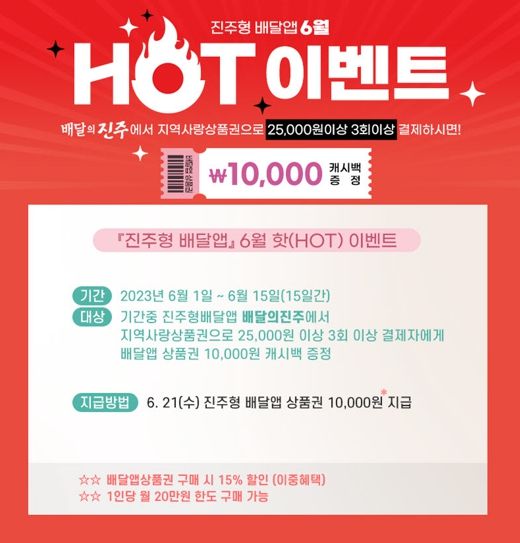[제주교통복지신문 김강석 기자] 진주시는 오는 6월 1일부터 15일까지 지역사랑상품권으로 2만 5000원 이상을 3회 이상 결제자에게 진주형 배달앱 상품권 캐시백 1만 원을 증정하는 이벤트를 진행한다.