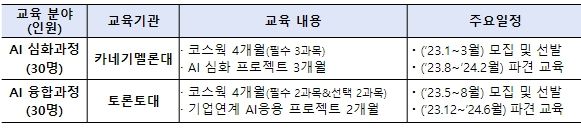 본 교육과정은 세계 유수 대학 내 맞춤형 교육과정을 개설하여 디지털 전략기술 분야 글로벌 고급 인재로 집중 육성하기 위한 해외교육사업 내 과정으로, 미국 카네기멜론대 연계과정과 토론토대 연계과정으로 구성됐으며,토론토대 연계과정은, 지난 해 윤석열 대통령의 캐나다 순방(’22.9월)을 계기로 토론토대학과 협력하여 국내 석ㆍ박사 인재들에게 AI+산업 영역 특화 맞춤형 교육과정을 제공하기 위해 개설됐다.