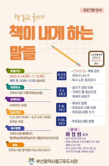 [제주교통복지신문 김강석 기자] 부산광역시립구포도서관은 오는 6월 24일부터 7월 15일까지 매주 토요일 오전 10시부터 2시간 동안 부산시민 20명을 대상으로 작가와 함께하는 글쓰기 프로그램 ‘책이 내게 하는 말들’을 운영한다.