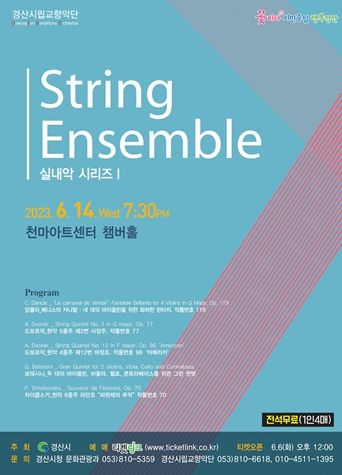 [제주교통복지신문 김강석 기자] 경산시립교향악단 실내악 연주회 String Ensemble이 6월 14일 오후 7시 30분 영남대학교 천마아트센터 챔버홀에서 전석 무료로 진행된다.