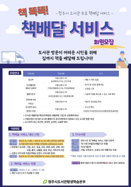 [제주교통복지신문 김강석 기자] 청주시립도서관은 도서관 책을 무료로 집까지 배달해주는‘책 똑똑! 책배달서비스’신청자를 모집한다고 1일 밝혔다.