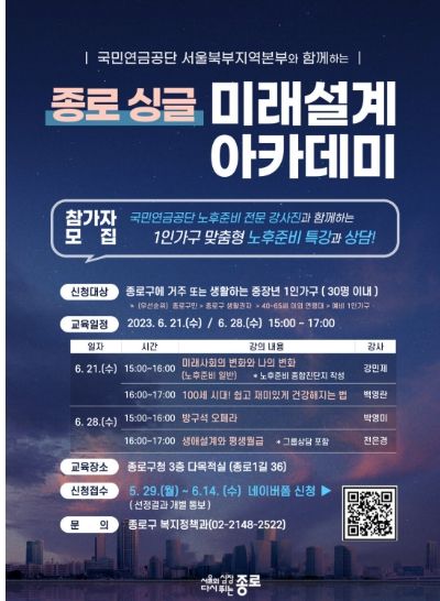 [제주교통복지신문 김강석 기자] 종로구가 오는 6월, 중장년 1인 가구를 위한 '종로 싱글 미래설계 아카데미'를 운영한다.