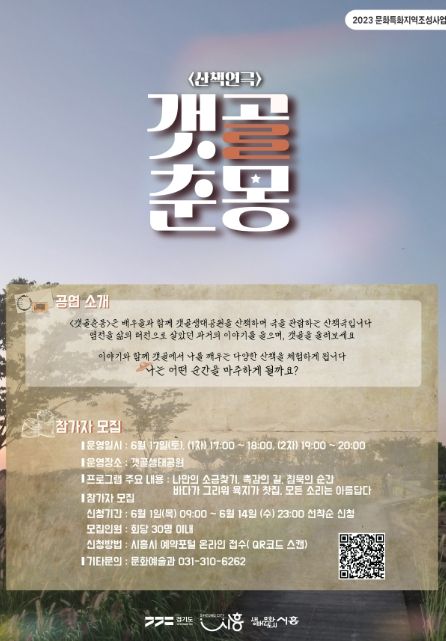 [제주교통복지신문 김강석 기자] 시흥시가 문화특화지역조성사업의 일환으로 지역 생태문화자원을 활용한 문화 향유 프로그램인 ‘갯골춘몽’을 오는 17일 갯골생태공원에서 진행한다.