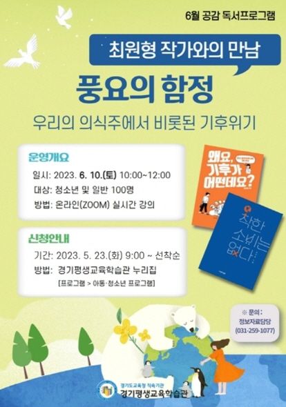 윤재철 경기평생교육학습관장은 “책과 더불어 건강한 지구와 기후위기에 대해 생각을 공유하고 소통함으로써 지역사회의 독서문화가 활성화되기를 기대한다”고 말했다.