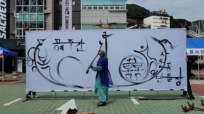 또한, ‘사천 공예 만들장(場)’에 담긴 의미를 기원하는 송강 김대현 장승명장의 드로잉 퍼포먼스(흰 스크린에 그려지는 대형 수묵화)가 시연돼 관람객에게 큰 감동을 안겨주었다.